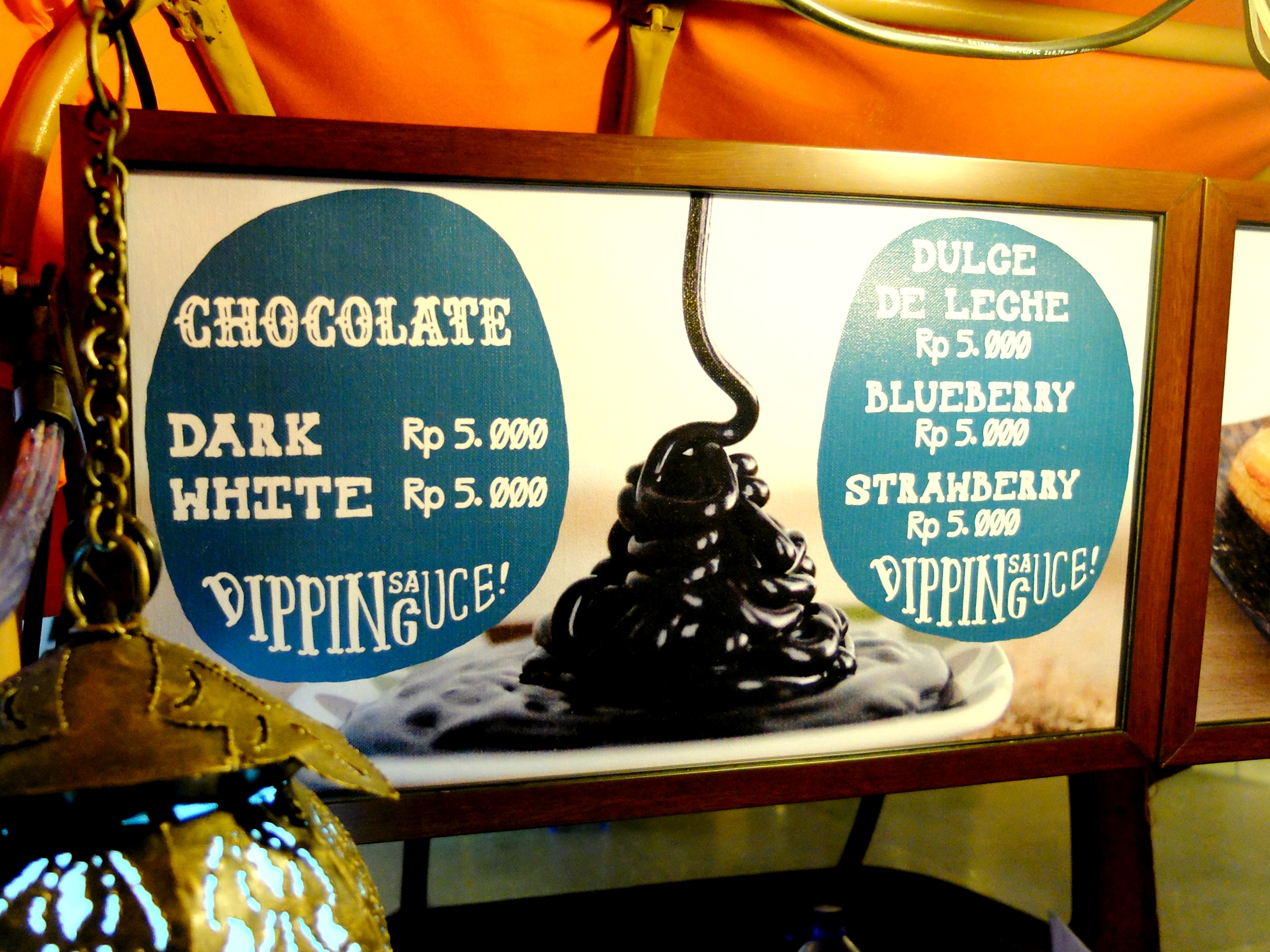 And there are also some dipping sauce available here : Chocolate, Caramel, Strawberry, and Blueberry. Undoubtedly, chocolate for the win!