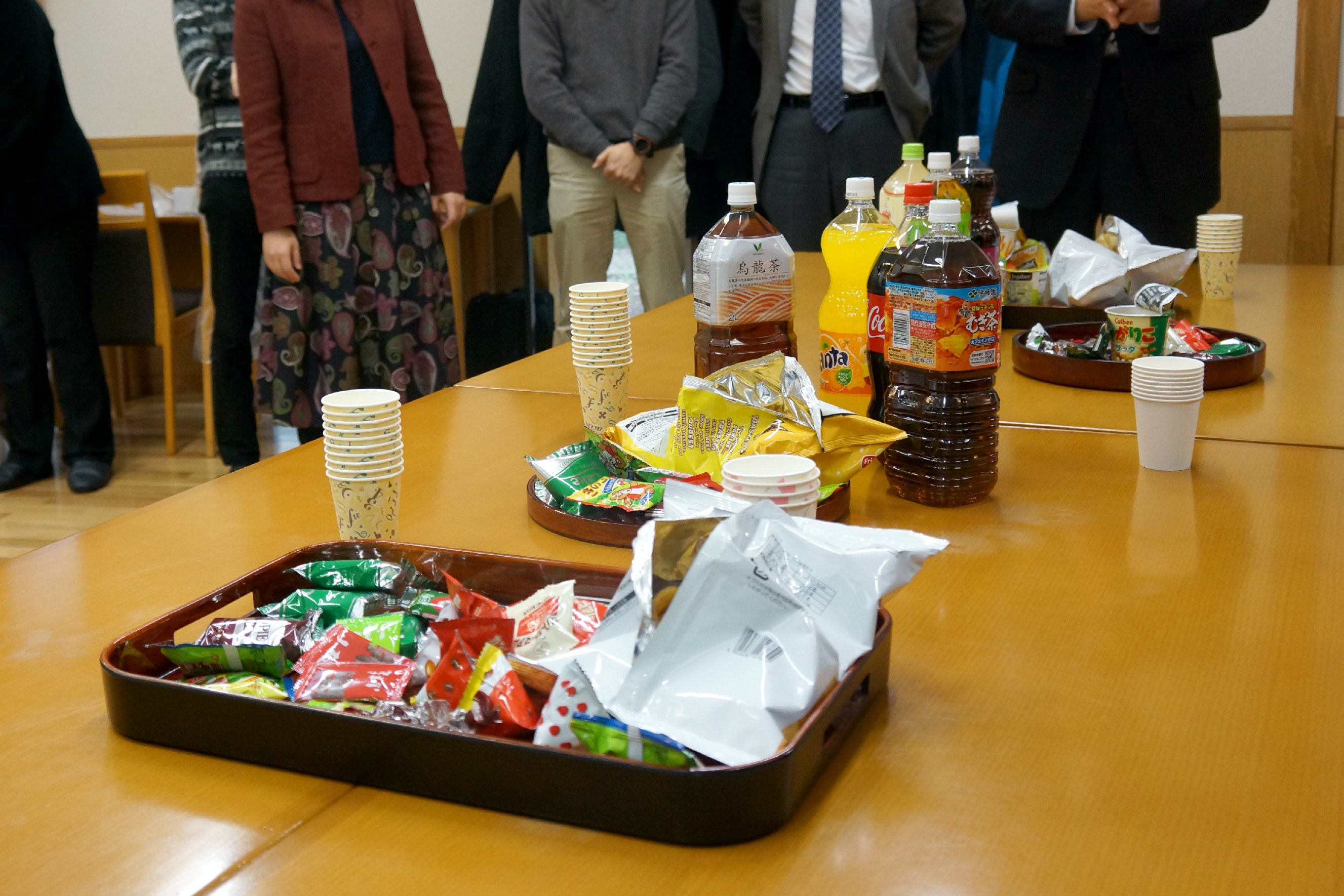 There are tables with some drinks and snacks in the middle of it. Then, people will gather round the table, take some drink, and do the kanpai!  – a toast.
