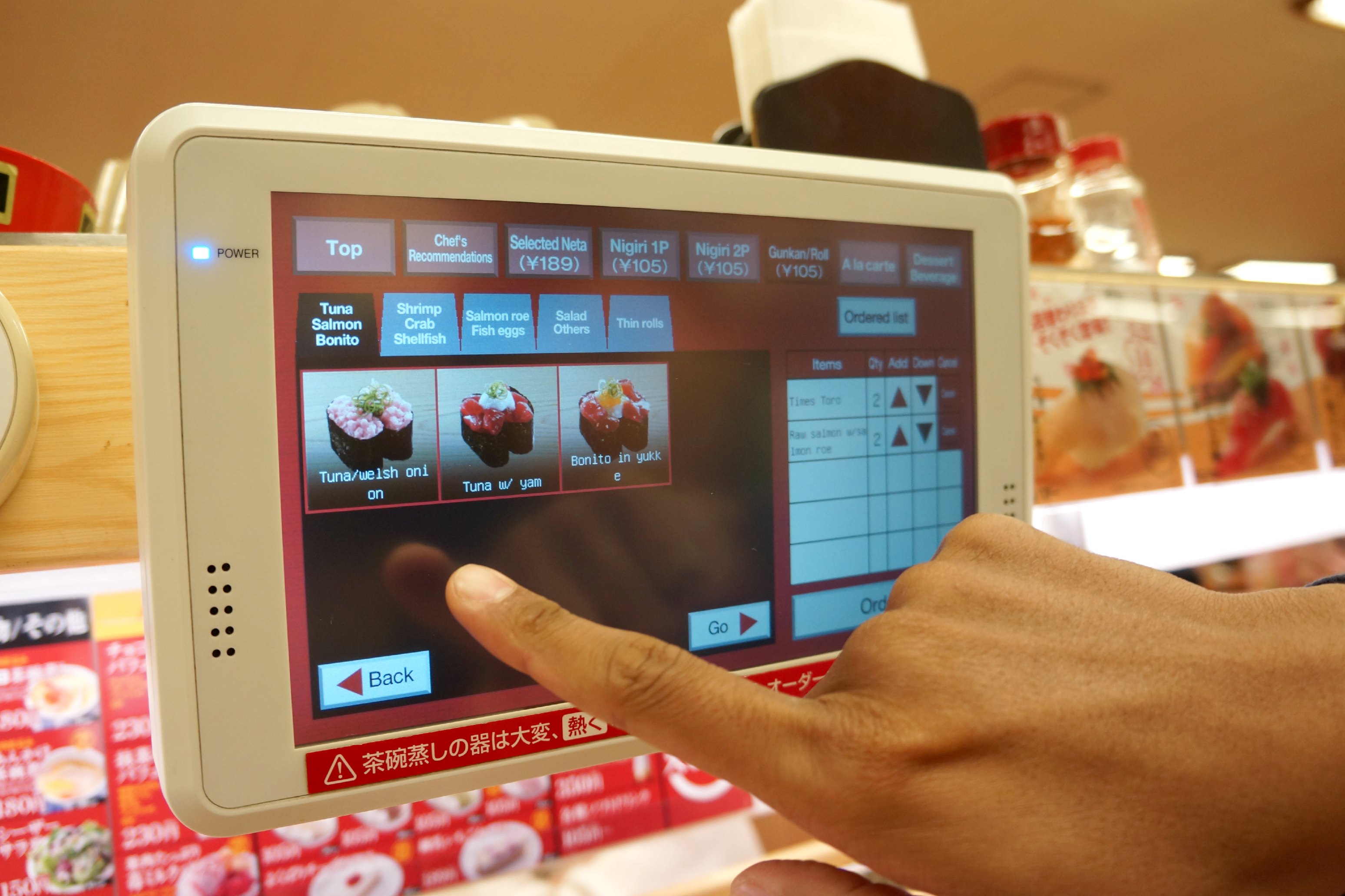 Each table has their own, let’s say, a tab where we can order our foods. Then, the chef will prepared our sushi and put it at the sushi bar. The surprising thing is, the bell will ring when our sushi is approaching!