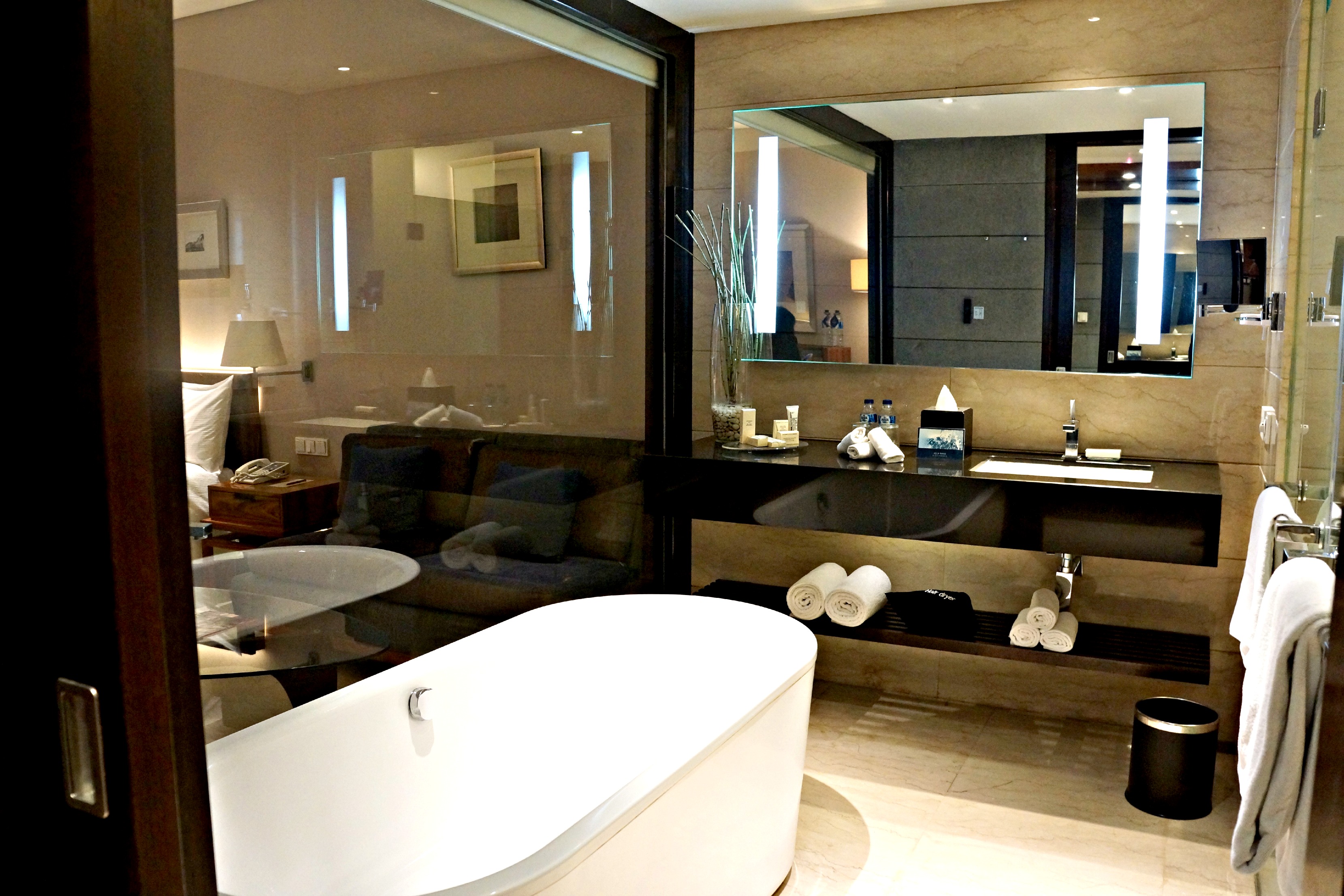 The room has a huge window facing to the city view. And it was completed with a large desk, a bath tub, a rain shower, a huge TV, a sofa, and of course, the very comfy and fluffy bed and blanket. I don’t wanna leave my room!