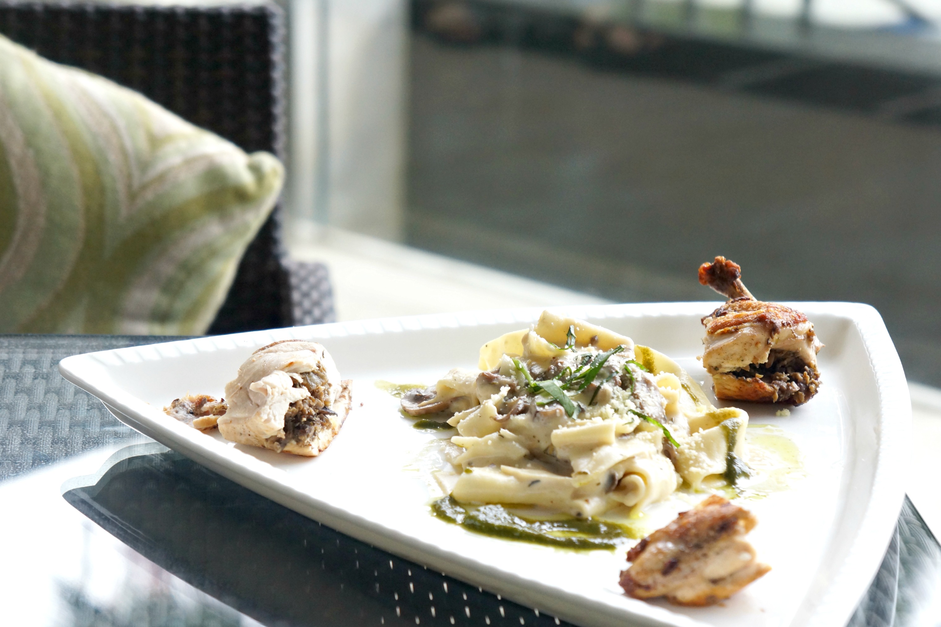 This was roasted Chicken Duxelle Mushroom served with Homemade Pappardelle, a large flat pasta. The pasta was lovely! It was perfectly cooked and served with parmesan cheese on top. Then there’s this stuffed chicken on the side.